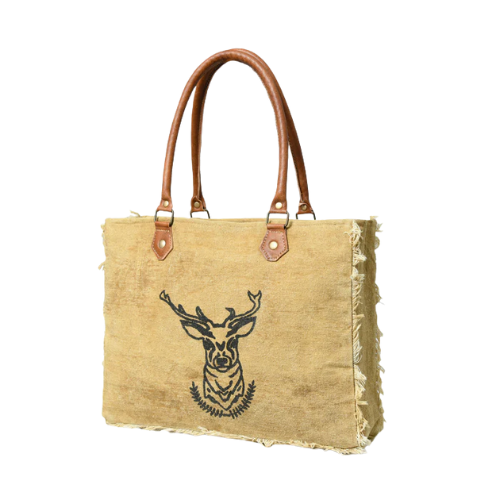 Command attention with the Regal Stag Canvas Tote Bag – a bold fusion of rugged charm and artisanal detail. Crafted from distressed canvas and adorned with a striking black stag illustration, this tote offers a raw yet refined look. The raw edges and sturdy leather handles give it a handcrafted appeal perfect for those who love standout accessories with personality.