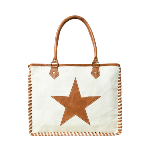 Make a confident statement with the Starry Charm Canvas Tote Bag, where rustic craftsmanship meets bold design. Featuring a striking tan leather star appliqué on a crisp white canvas base, this tote is finished with hand-stitched detailing and rich leather accents. It’s spacious, stylish, and ready to be your everyday essential with a touch of individuality.